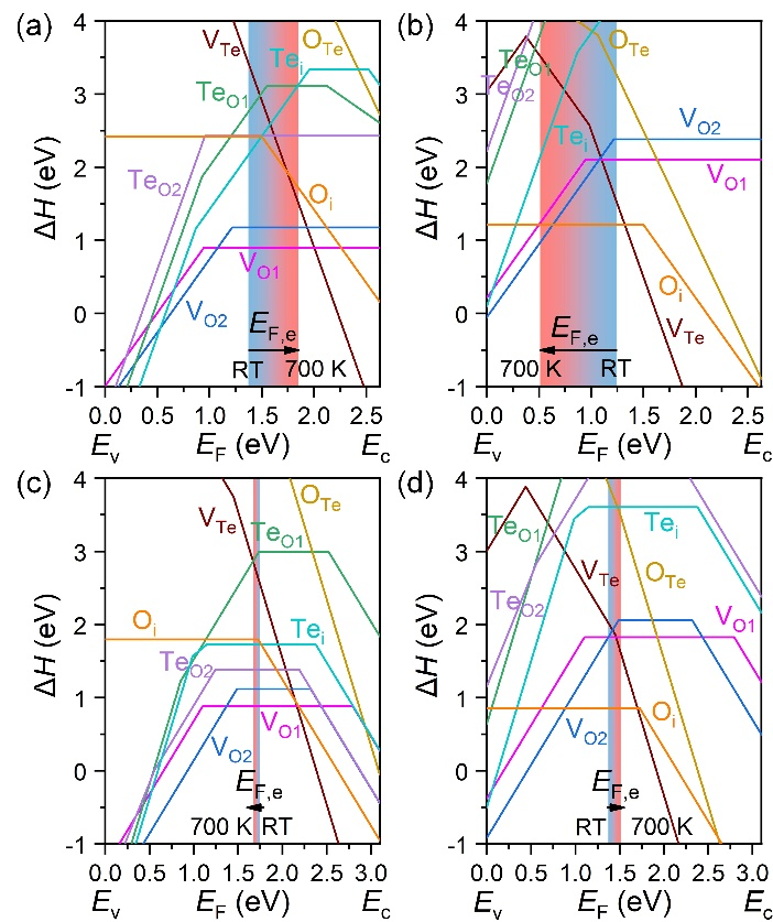 图4 β-TeO2块体(a,b)和单层(c,d)中本征缺陷在富Te(a,c)和富O(b,d)条件下的形成能。不论化学条件和生长温度如何,平衡费米能级位于带隙中间区域,无法产生可观的载流子浓度,表现出绝缘特性。