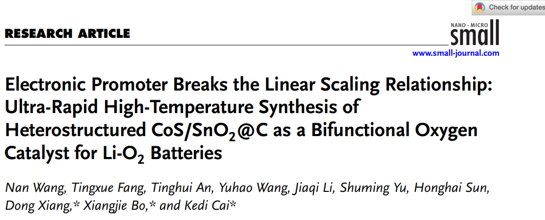 渤海大学化学与材料工程学院教师王楠与分析化学专业硕士研究生房廷雪为共同第一作者,渤海大学蔡克迪教授,项东博士与东北师范大学薄祥洁副教授为共同通讯作者的研究成果《Electronic Promoter Breaks the Linear Scaling Relationship: Ultra-rapid High-temperature Synthesis of Heterostructured CoS/SnO2@C as a Bifunctional Oxygen Catalyst for Li-O2 Batteries》发表于国际纳米材料领域知名期刊《Small》(中科院2区,IF:13,Top期刊)。