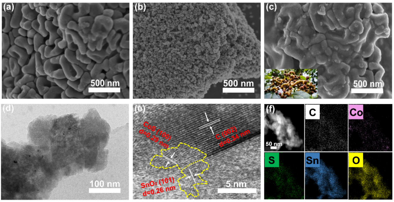 (c)CoS/SnO2@C的SEM图像(插图为拐枣实物图片);