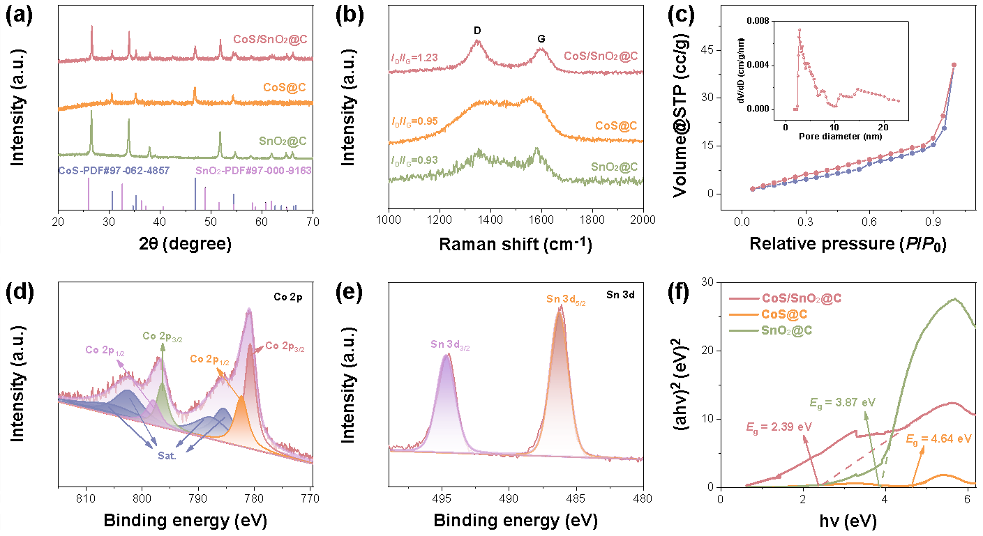 XRD进一步证明CoS/SnO2@C的成功制备,Raman光谱显示CoS/SnO2@C具有更高的石墨化程度,有利于提高电导率并促进电子转移。N2吸附-脱附分析表明CoS/SnO2@C为介孔结构。XPS分析证明了电子从Sn位点向Co位点的转移,且较CoS@C和SnO2@C来说,CoS/SnO2@C异质结构引入的杂质能级使禁带Eg变窄,增强了载流子对导带的激发,从而提高了电导率。