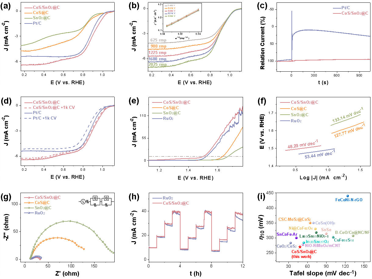 ORR/OER电化学性能分析表明CoS/SnO2@C具有优异的电催化活性,甚至优于商业Pt/C和RuO2,与近期报道的催化剂相比也具有显著优势。