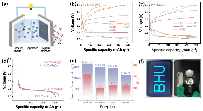 (d)CoS/SnO2@C和Pt/C+RuO2的作为锂氧电池阴极的首次放电曲线;