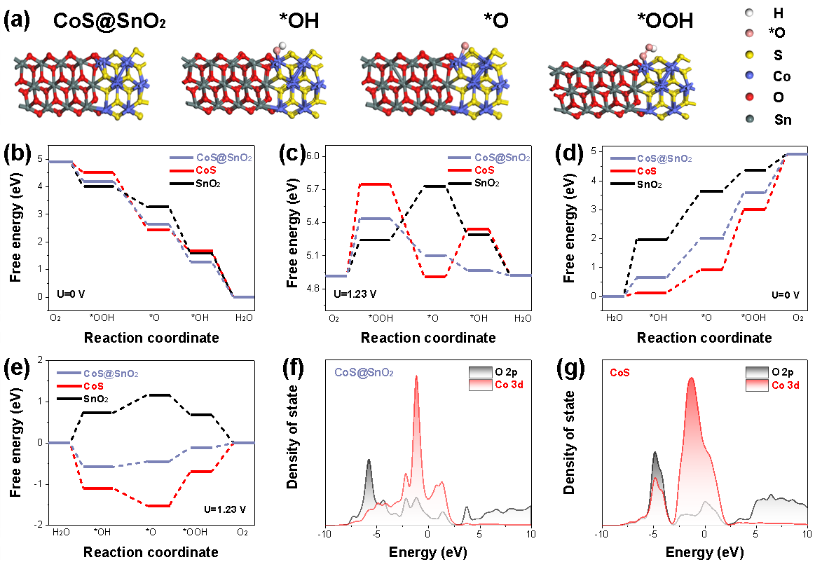 DFT计算表明,CoS(100)与SnO2(101)形成异质结构后,SnO2(101)作为电子助剂,实现了Co位点电荷的重新分布,减弱了*O在CoS(100)界面上的强吸附,从而降低了异质结构CoS@SnO2上ORR/OER的自由能垒。