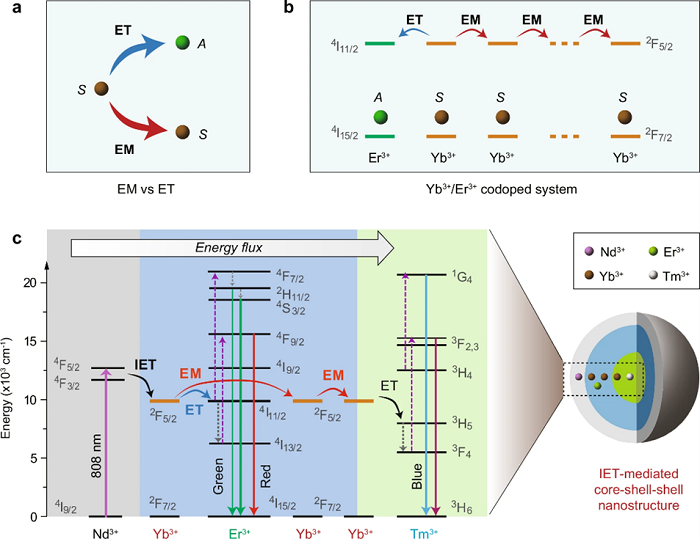 本文通过IET介导的纳米核壳结构设计研究了能量迁移和能量传递的竞争过程。敏化剂/激活剂共掺体系中存在能量迁移和能量传递的激烈竞争,可通过掺杂浓度、壳层厚度和结构设计等精细调控动力学过程,为上转换光色时域调控提供了重要方法。本文的研究结果有助于推动纳米尺度光物理过程的基础研究,对于研发下一代非线性光电器件具有重要借鉴意义。