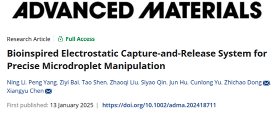 微液滴的精准生成与操控在打印技术、微流控生物芯片、药物递送及柔性传感器等领域具有重要意义。然而,现有的微纳尺度液滴生成与反应技术仍面临诸多挑战,如液滴尺寸控制精度不足、液体传输效率低以及多功能操控能力受限等。为此,中国科学院北京纳米能源与系统研究所李宁副研究员、陈翔宇研究员与理化技术研究所董智超研究员合作,提出了一种全新的基于静电捕获与释放的液滴操控系统(Electrostatic Wetting-Based Emission and Transportation,EWET)。该系统成功实现了对微纳尺度液滴的精准捕获、释放与高效传输。相关研究成果以题为“Bioinspired Electrostatic Capture-and-Release System for Precise Microdroplet Manipulation”于1月13日发表在《Advanced Materials》,标志着微液滴操控技术的又一重要突破。