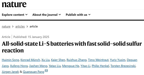 文献链接:“All-solid-state Li–S batteries with fast solid–solid sulfur reaction”(Nature,2024,10.1038/s41586-024-08298-9)