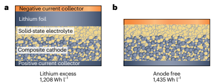 在无阳极SSB中,完全锂化(放电)的阴极活性材料,如LiNi0.8Co0.1Mn0.1O2,与负极SSE界面处不存在过量锂金属的集流体配对。金属锂在充电时被镀在集流体上,放电时被剥离。由于某些固态电池与锂金属具有良好的界面稳定性,并且固体-电解质界面相(SEI)的形成在空间上仍然局限于该平面界面,因此无阳极SSB可以说比无阳极液态电池更有前途,因为无阳极液态电池在每个充放电周期中都倾向于持续形成SEI。
