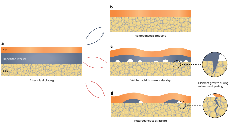 常规锂过量SSBs的性能在很大程度上取决于锂SSE界面的动态演变。在电池放电过程中,锂从界面上被移除(剥离),如果这个过程发生得太快,无法补充耗尽的锂,就会形成空隙,导致界面接触损失和高阻抗。这种形式的界面接触损失发生在固态电池中,而不在液态电解质电池中发生,它会强烈影响循环行为。在随后的充电中,不完美的接触会导致不均匀的锂沉积,在空隙周围的电流浓度会导致枝晶和丝状生长,从而穿透SSE并导致短路。