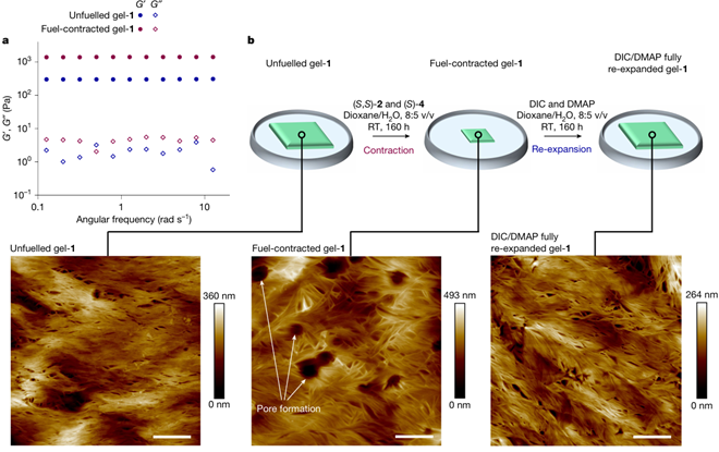 图3凝胶-1在化学燃料收缩和随后的化学燃料再膨胀前后的流变学和原子力显微镜比较;© Springer Nature Limited 2025