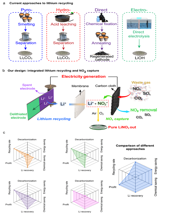 中国科学技术大学陈维教授团队结合近年来的研究成果,在国际顶级期刊 Nature Sustainability 上发表了题为 “Electrochemical lithium recycling from spent batteries with electricity generation” 的研究论文。该研究首次提出了一种基于电化学原理的绿色可持续回收策略,能够协同实现废旧锂离子电池中锂资源的高效回收与工业尾气中二氧化氮污染物的治理。研究团队巧妙设计了一种无能量消耗的回收方法,利用尾气中二氧化氮的电化学还原电位与废旧电池正极材料的电化学氧化电位差,不仅成功回收了废旧电池正极材料中的锂资源,还将二氧化氮转化为高价值的硝酸锂盐。与此同时,这一过程还能实现大量的能量输出,为锂回收与污染物治理提供了一种高效、环保且具有经济价值的全新解决方案。本文的第一作者为中国科学技术大应用化学系博士研究生王卫平。唯一通讯作者为中国科学技术大学应用化学系和合肥国家微尺度物质科学研究中心教授陈维。