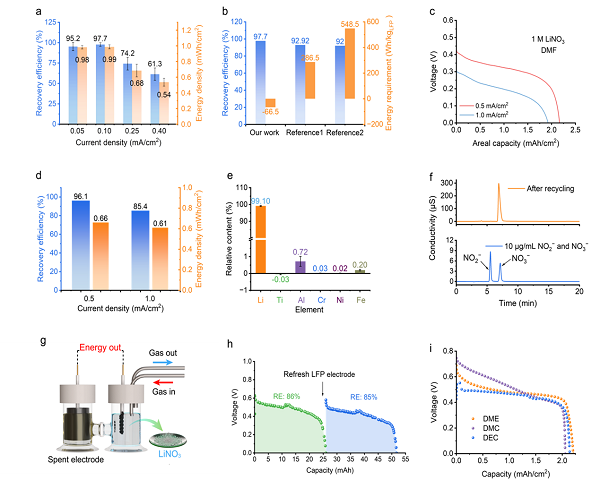 【图3】 (a) 不同回收电流密度下锂回收率测试结果。(b) 不同电化学回收法所消耗的能量比较。(c) 采用硝酸锂电解液回收性能曲线。(d) 采用硝酸锂电解液所得到的锂回收率和能量输出结果。(e) 硝酸锂产物中金属阳离子含量分析。(f) 硝酸锂产物中阴离子纯度分析。(g) H型槽回收装置示意图。(h) H型槽回收装置回收性能曲线。(i) 二氧化氮还原侧不同电解液回收性能曲线。