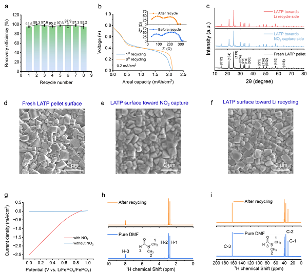 为了确保该回收系统能够实现长时间稳定运行,作者对关键部件进行了深入研究和表征,包括固态电解质隔膜和二氧化氮还原侧的电解液。通过循环回收使用测试、电化学阻抗分析、晶体结构以及微观形貌观测,结果表明固态电解质隔膜在非水系电解液中展现出优异的稳定性和耐久性(图4a-4f)。此外,通过对电解液的电化学窗口测试以及二氧化氮还原前后电解液的核磁共振分析,结果显示所使用的有机电解液在电化学过程中均展现出良好的稳定性,从而避免了电解液的持续消耗和频繁补充(图4g-4i)。