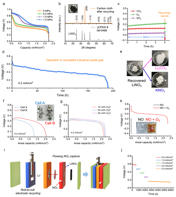 【图5】 (a) 干扰气体存在下电化学回收性能曲线。(b) 经过空气氧化之后碳布电极的X射线衍射结果。(c) 不同干扰气体的电化学还原性能曲线。 (d) 长时间模拟工业尾气回收测试曲线。(e) 硝酸锂进一步转化至碳酸锂和硝酸钾。(f) 模拟低二氧化氮浓度工业尾气下电化学回收性能曲线。(g) 水蒸汽存在下电化学回收性能曲线。 (h) 化学氧化和电化学还原协同的一氧化氮回收性能曲线。(i) 流动式回收装置示意图。(j) 流动式回收电化学性能曲线。
