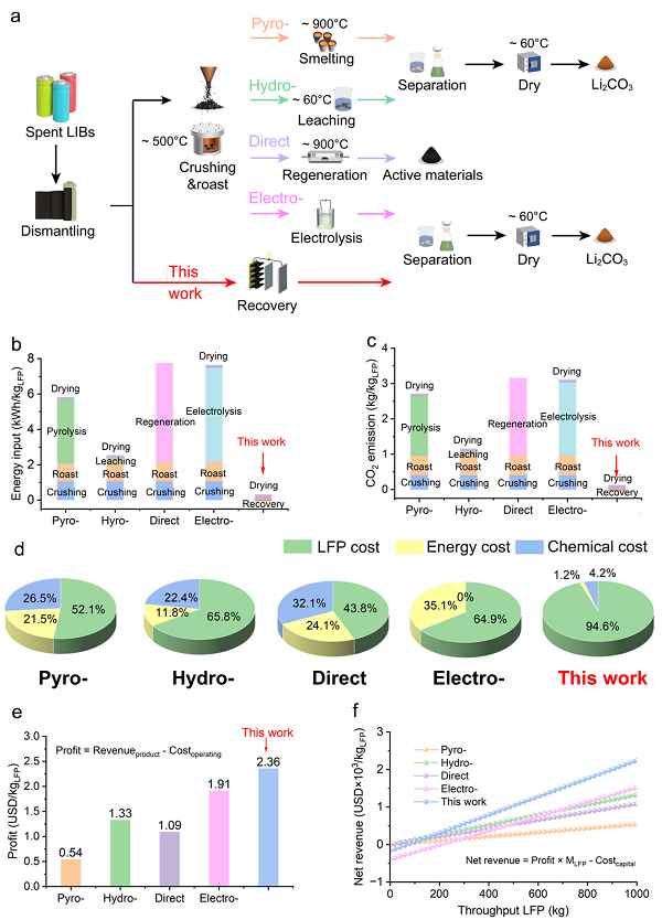 【图6】 (a) 不同电池回收策略中典型的核心生产工艺。(b) 不同废旧电池回收策略中各生产步骤能量消耗结果。 (c) 不同废旧电池回收策略中各生产步骤二氧化碳排放结果。 (d) 不同废旧电池回收策略中化学品成本核算结果。 (e) 不同废旧电池回收策略中每千克磷酸铁锂材料回收收益。 (f) 不同废旧电池回收策略净收入预测情况。