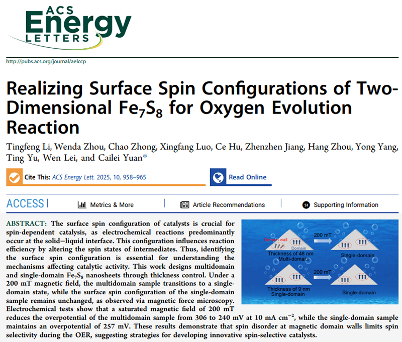 近期,江西师范大学袁彩雷教授团队通过控制CVD生长温度,成功制备了不同厚度的Fe7S8纳米片。磁力显微镜(MFM)观测结果表明,不同厚度的纳米片具有不同的表面自旋构型(约48 nm时为多畴构型,9 nm时为单畴构型)。通过比较多畴和单畴样品在外加磁场作用前后的表面自旋构型及OER性能,研究团队成功揭示了磁畴壁中的自旋无序对OER自旋选择性的影响。这一研究成果已发表于《ACS Energy Letters》,题为《Realizing Surface Spin Configurations of Two-Dimensional Fe7S8 for Oxygen Evolution Reaction》。江西师范大学袁彩雷教授为通讯作者,硕士研究生李廷峰为第一作者,周文达博士和硕士研究生钟超为共同第一作者。