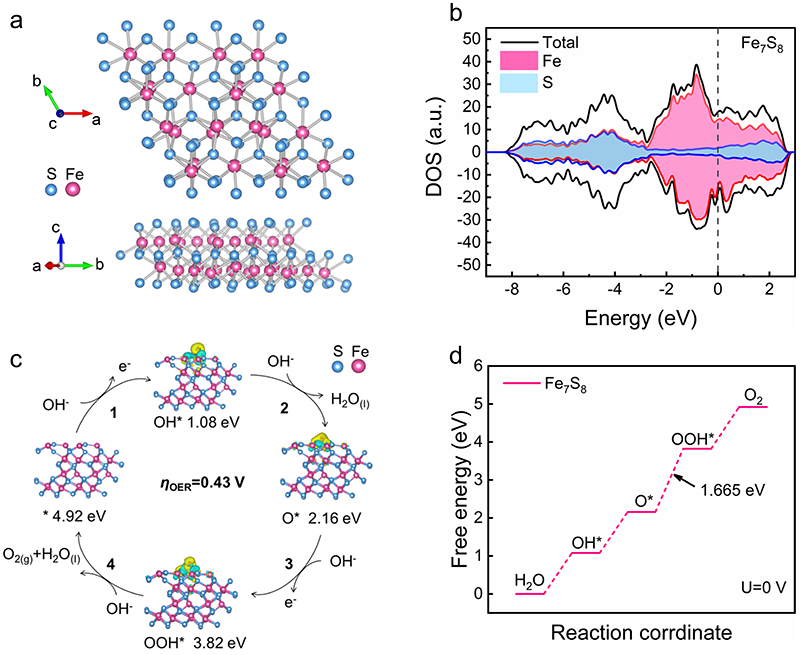 图1. 理论计算。(a)Fe7S8的晶体结构;(b)Fe7S8纳米片的态密度;(c)Fe7S8的OER机制的示意图;η表示速率决定步骤的理论过电位;(d)Fe7S8在0 V时的吉布斯自由能图示。