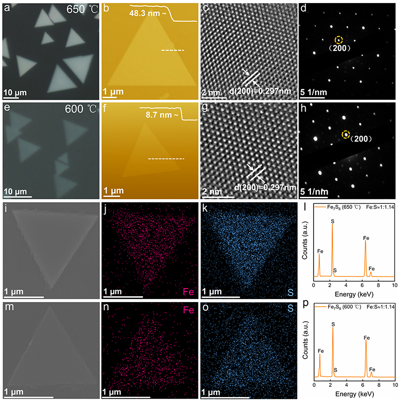 图2. CVD合成的二维Fe7S8纳米片结构表征。(a, e)分别在650 ℃和600 ℃生长温度下,Fe7S8纳米片在云母基底上的光学显微镜图像;(b, f) 分别在650 ℃和600 ℃生长温度下典型Fe7S8纳米片的原子力显微镜图像及相应的高度剖面;(c, g) 分别在650 ℃和600 ℃生长温度下Fe7S8纳米片的HRTEM图像。(d)(c)的相应SAED图样;(h)(g)的相应选区电子衍射图样;(i)在650 ℃生长温度下Fe7S8纳米片SEM图像,(m)在600 ℃生长温度下的SEM图像;(j, k)(i)的Fe和S元素的相应EDS映射图像;(n, o)(m)的Fe和S元素的相应EDS映射图像;(l)(i)的相应能谱元素分析图谱;(p)(m)的相应能谱元素分析图谱。
