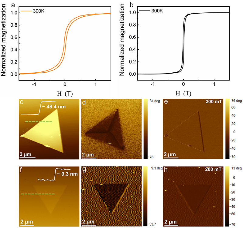 图3. CVD合成的二维Fe7S8纳米片的磁性特性。图(a)和(b)分别展示了在300 K下,磁场垂直于Fe7S8纳米片基底平面时,生长温度为650 ℃和600 ℃的磁滞回线;(c) 在650 ℃生长温度下Fe7S8纳米片的原子力显微镜图像及相应的高度剖面;(d, e) 分别是在没有200 mT磁场和有200 mT磁场下的相应MFM图像;(f)在600 ℃生长温度下Fe7S8纳米片的原子力显微镜图像及相应的高度剖面;(g, h)分别是在没有200 mT磁场和有200 mT磁场下的相应MFM图像。