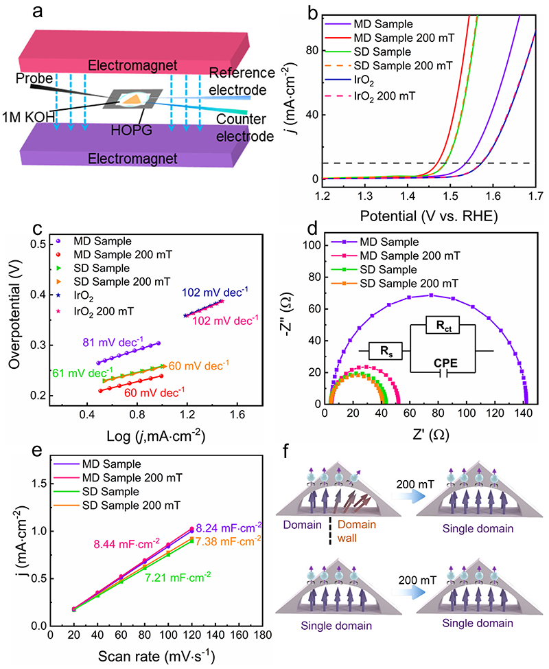 图4. 多畴(MD)和单畴(SD)样品在存在和不存在200 mT磁场下的电化学活性。(a)电化学微电池设置的示意图。HOPG(高度定向热解石墨)作为样品的基底;(b)在存在和不存在200 mT磁场下,多畴(MD)和单畴(SD)样品及IrO2的iR校准后的线性扫描伏安曲线;(c)在存在和不存在200 mT磁场下,多畴(MD)和单畴(SD)样品及IrO2的相应Tafel图;(d)在存在和不存在200 mT磁场下,多畴(MD)和单畴(SD)样品的Nyquist图;(e)在存在和不存在200 mT磁场下,多畴(MD)和单畴(SD)样品的Cdl;(f)200 mT外部磁场下多畴(MD)样品和单畴(SD)样品的磁结构和自旋状态分布演变示意图。