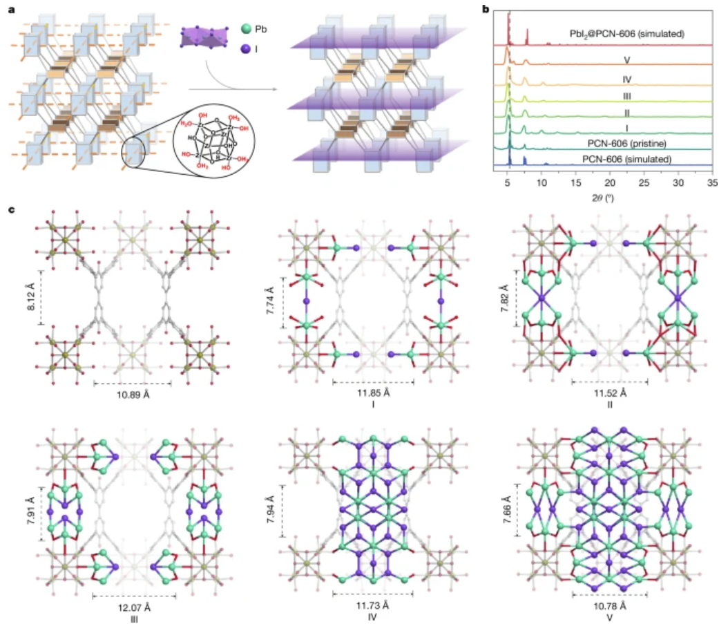b: 中间体I-V的PXRD图谱,显示从PCN-606到PbI₂@PCN-606超晶格的转变过程。