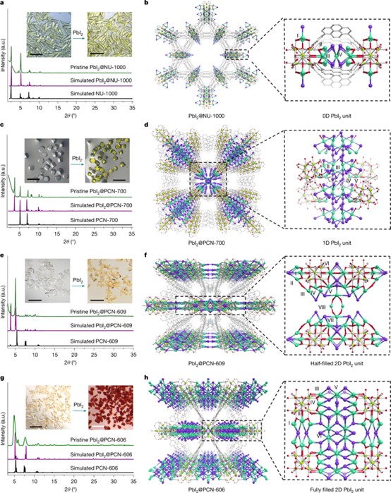 a, c, e, g: MOF和PbI₂@MOF超晶格的粉末X射线衍射(PXRD)图谱和照片:NU-1000和0D PbI₂@NU-1000(a),PCN-700和1D PbI₂@PCN-700(c),PCN-609和半填充2D PbI₂@PCN-609(e)以及PCN-606和全填充2D PbI₂@PCN-606(g)。标尺为0.2 mm。b, d, f, h: 0D PbI₂@NU-1000(b),1D PbI₂@PCN-700(d),半填充2D PbI₂@PCN-609(f)和全填充2D PbI₂@PCN-606(h)的单晶结构。放大区域的PbI₂单元的详细结构用虚线框标出。放大区域中的不同晶体学Pb位点用罗马数字标记。黄色、绿色、紫色、灰色和红色球分别代表Zr、Pb、I、C和O原子,氢原子为清晰起见省略。