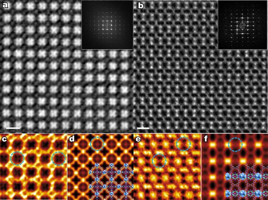d, f: PbI₂@PCN-700(d)和PbI₂@PCN-606(f)超晶格的模拟投影势。插图:基于SC-XRD晶体学的理想超晶格的投影结构模型。虚线圆圈表示与相邻Zr节点结合并嵌入MOF框架空腔中的投影PbI₂簇的典型对比度。标尺为2 nm。