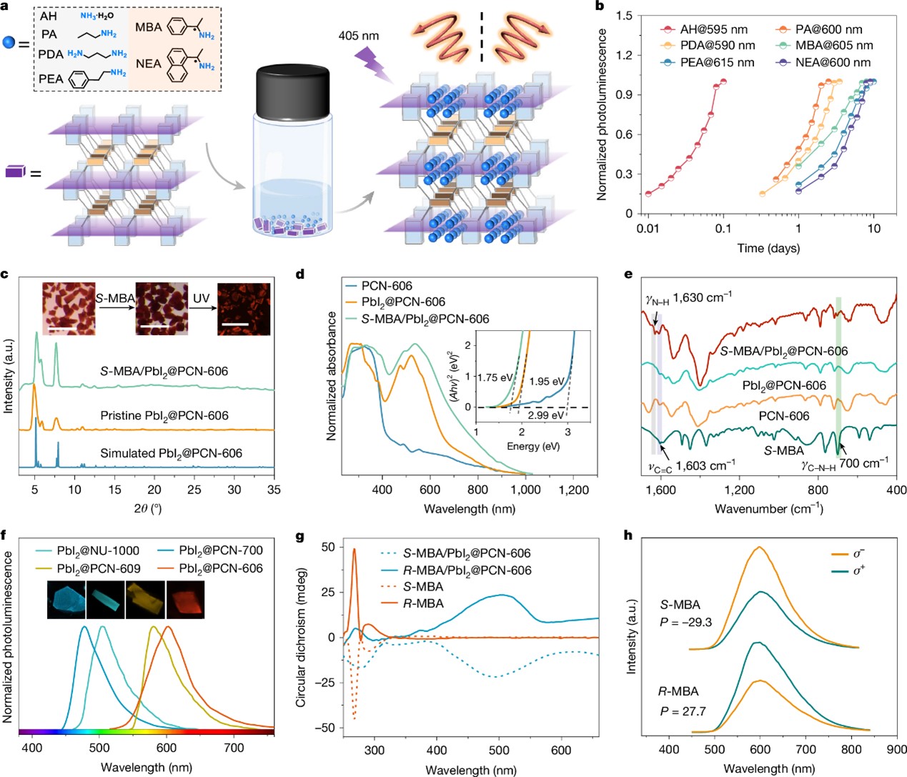 图4 | 胺修饰的PbI₂@MOF超晶格的制备及光学表征© 2024 Nature