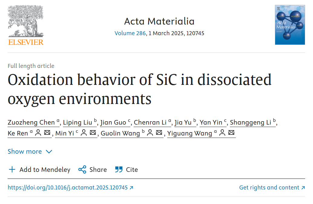 原文详情:Chen, L. Liu, J. Guo, C. Li, J. Yu, Y. Yin, S. Li, K. Ren, M. Yi, G. Wang, Y. Wang, Oxidation behavior of SiC in dissociated oxygen environments, Acta Materialia 286 (2025) 120745. https://doi.org/10.1016/j.actamat.2025.120745.