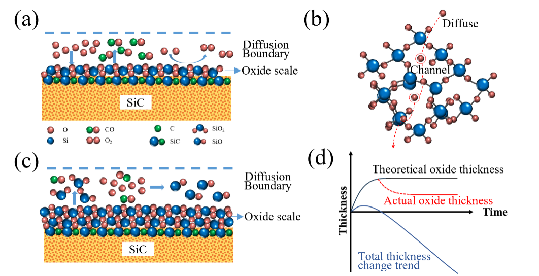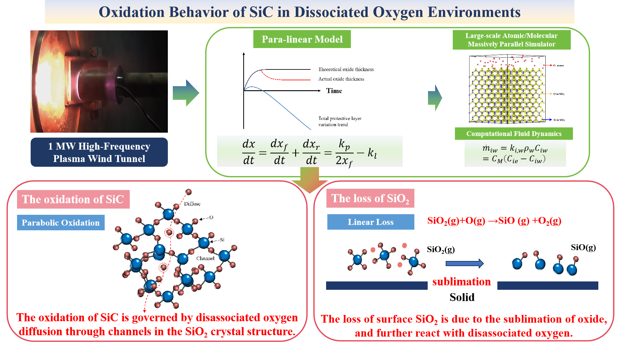 北京理工大学王一光课题组、南京航空航天大学易敏课题组、中国空气动力研究与发展中心王国林课题组利用高频等离子体风洞产生离解氧环境,研究了碳化硅在该环境中的氧化行为。在实验中,同时观察到材料表面的二氧化硅的生成和氧化层的厚度减少。采用线性-抛物线曲线拟合实验数据,以区分氧化层的生成和损失过程。通过分子动力学模拟和空气动力学计算,发现SiC的氧化受离解氧扩散通过二氧化硅晶体结构中的通道扩散控制,而表面二氧化硅的损失是由于其升华控制。这些发现为确定飞行器高速飞行过程中的碳化硅材料的失效边界奠定了理论基础。