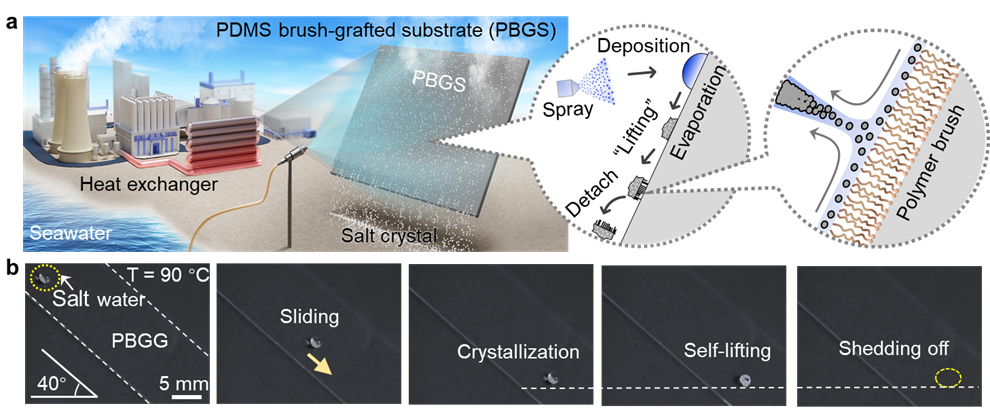 喷雾冷却通过液滴蒸发带走基底表面热量,是有效的冷却方式。利用海水代替淡水进行喷雾冷却是解决淡水资源危机的有效手段。然而,盐晶在蒸发表面结垢将降低换热效率并发生表面腐蚀,严重制约盐水在喷雾冷却中的应用。目前,现有的防盐垢蒸发表面盐晶难以自脱附,如何降低盐晶与基底表面的粘附力是关键。