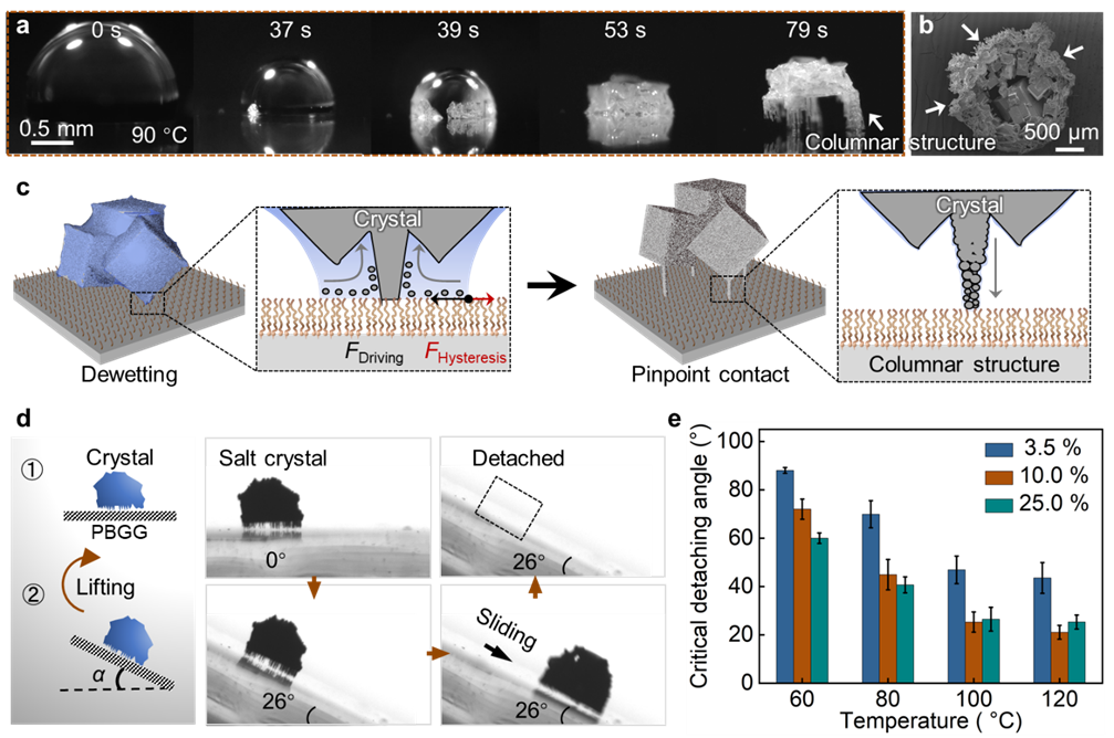 图2. 聚硅氧烷分子刷接枝玻璃表面(PBGG)表面盐水蒸发、结晶及盐晶脱附性能。(a)1-μL, 10 wt% NaCl液滴在90 °C PBGG表面的蒸发过程,蒸发末期,盐晶底部形成柱状结构,盐晶自基底表面提升。(b)盐晶底部电镜图,蒸发早期形成块状晶体,蒸发末期在盐晶底部外围形成柱状结构。(c)PBGG表面盐晶结晶机理示意图。由于PBGG表面超低的接触角滞后,NaCl饱和溶液在蒸发末期自基底表面迁移至盐晶,形成液桥,盐晶在液桥内限域纵向生长,最终在盐晶底部形成柱状结构,盐晶与基底表面间少量点状接触模式可大大降低盐晶与基底间粘附力。(d)1-μL, 25 wt% NaCl液滴在100 °C PBGG表面的蒸发后,基底表面倾斜26°,盐晶在重力作用下自基底表面滑落。(e)基底温度以及NaCl浓度对盐晶脱落所需倾斜角度的影响,基底温度越高,NaCl浓度越高,盐晶脱落所需基底倾斜角度越小。