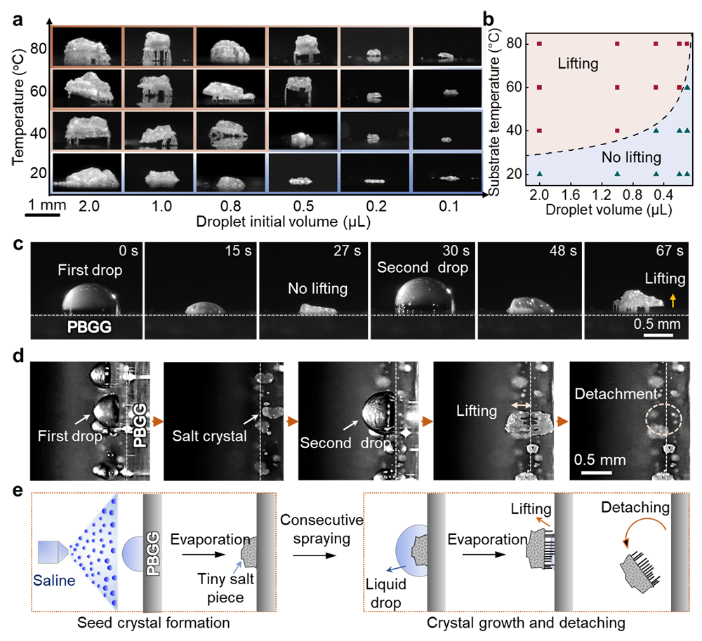 图3. 小体积NaCl液滴在聚硅氧烷分子刷接枝玻璃表面(PBGG)表面结晶及盐晶脱附性能。不同体积3.5 wt% NaCl液滴在不同温度PBGG表面盐晶提升现象(a)及对应相图(b),小体积液滴以及基底温度较低时,盐晶无自提升现象。(c)第一滴0.1 μL NaCl液滴在60 °C PBGG表面蒸发后无盐晶自提升现象,第二滴滴加后盐晶出现自提升现象。(d)将3.5 wt% NaCl溶液连续喷洒在垂直放置PBGG表面(90 °C),第一滴盐滴蒸发后盐晶粘附在PBGG表面,第二滴盐滴蒸发后盐晶自PBGG表面自提升并脱落。(e)垂直PBGG表面盐滴连续喷洒、蒸发、结晶,盐晶脱附示意图,第二滴盐滴蒸发结晶后盐晶自PBGG表面脱附。