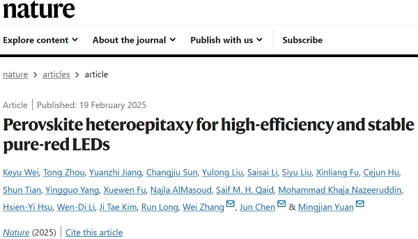 原文详情:Perovskite heteroepitaxy for high-efficiency and stable pure-red LEDs (Nature 2025, DOI: 10.1038/s41586-024-08503-9)