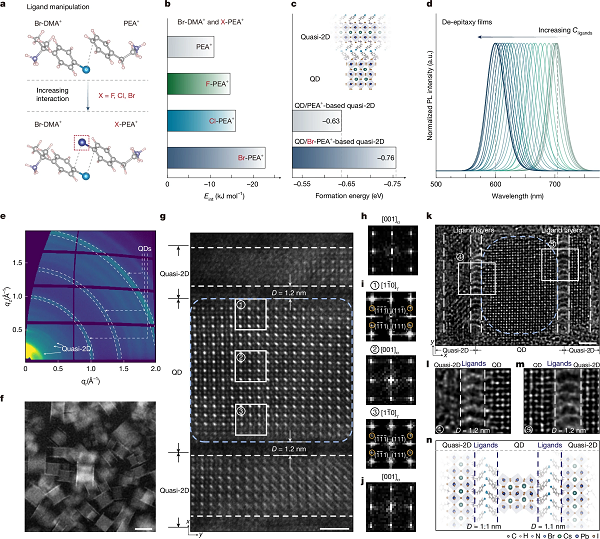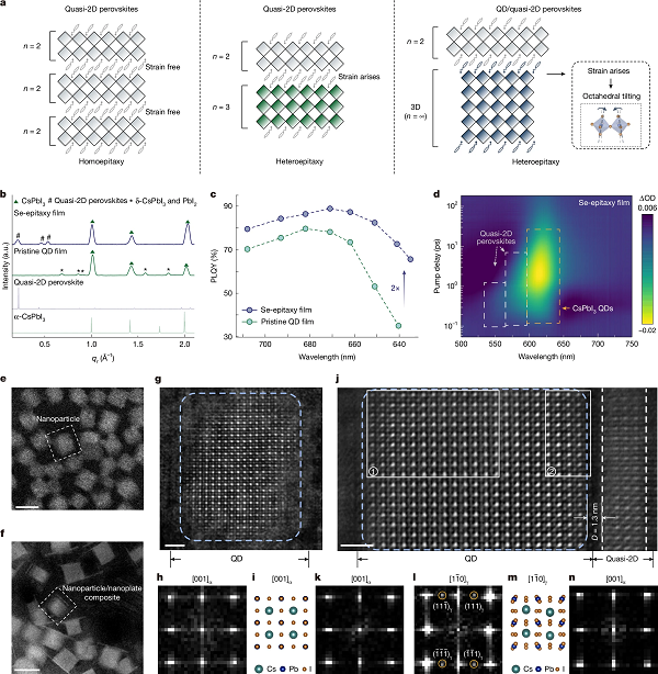 图2 去外延薄膜中的准2D/CsPbI3 QD/准二维钙钛矿异质外延 © 2025 Springer Nature