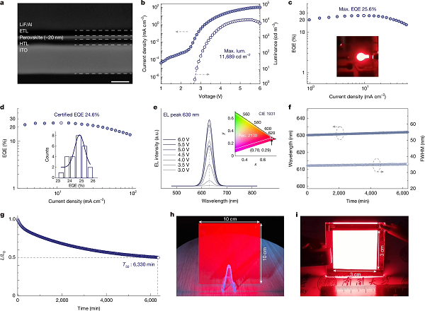 图4 基于CsPbI3 QD去外延薄膜的纯红色PeLED性能和操作稳定性 © 2025 Springer Nature