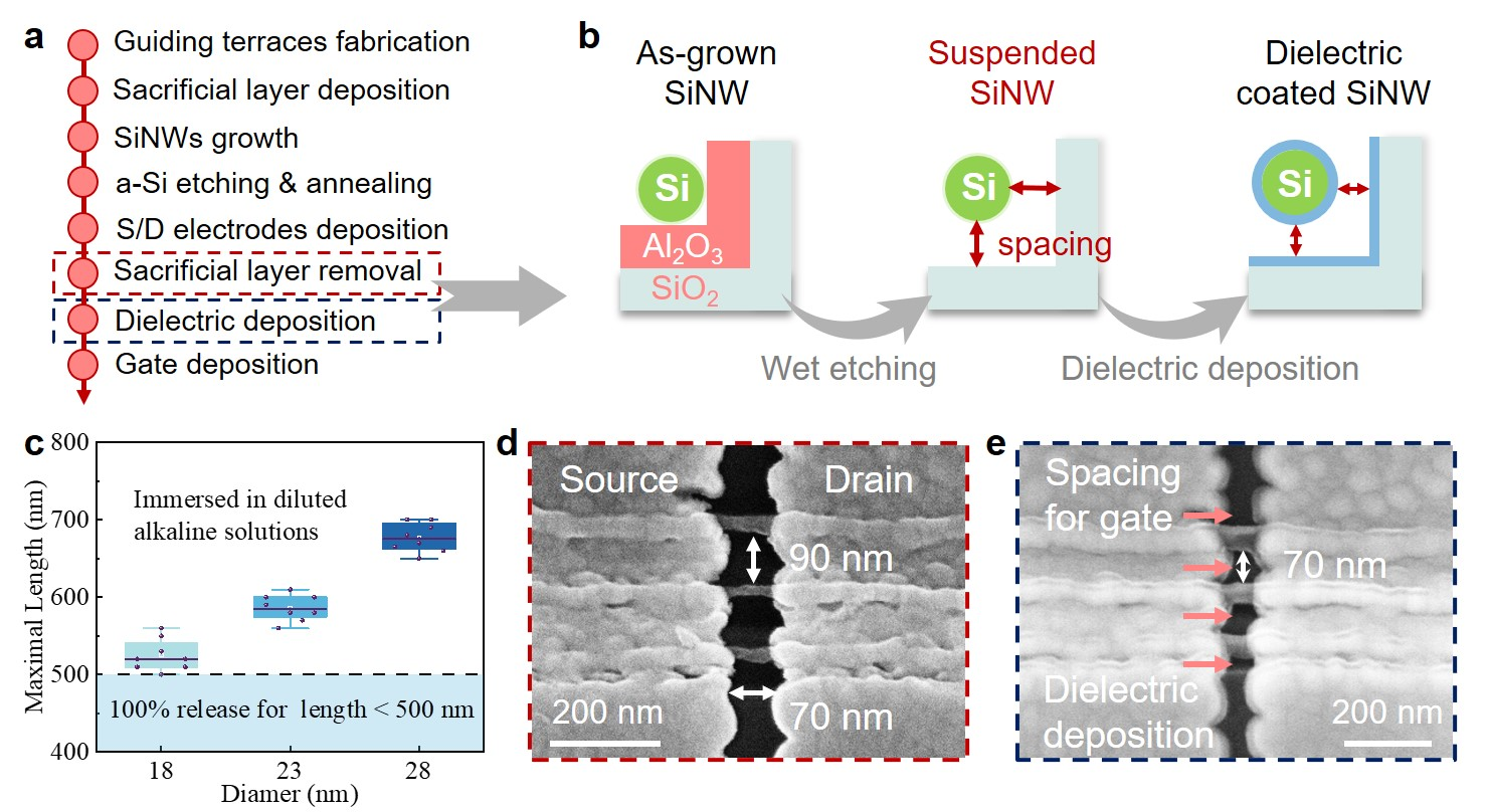 研究团队利用原始创新的IPSLS纳米线生长机制,通过调整催化剂厚度和沉积条件,实现了对硅纳米线直径的高度可控性。这种精准控制使得纳米线能够适应制备GAA-FET器件严格的形貌控制需求。