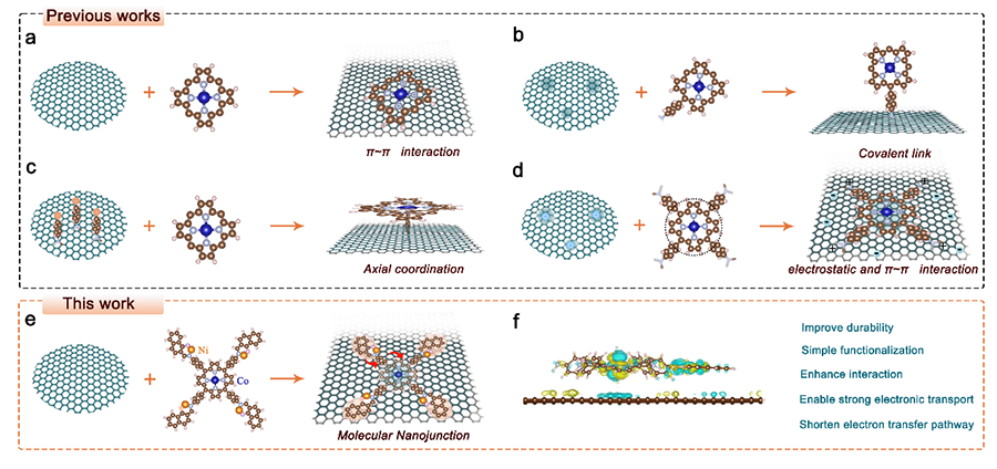 示意图1.a–d)前人的研究总结,包括:(a)π–π相互作用,(b)共价连接,(c)轴向配位,(d)静电和π–π相互作用。e,f)“分子纳米结”催化剂的示意图及其优势。