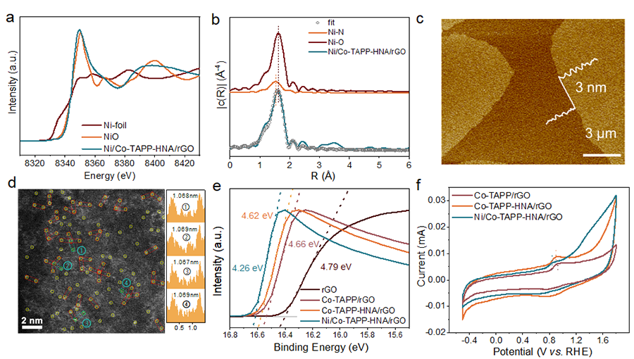 图2.a)Ni、NiO和Ni/Co-TAPP-HNA/rGO的Ni K边XANES光谱比较。b)R空间中的EXAFS拟合曲线;c)Ni/Co-TAPP-HNA/rGO的AFM图像。d)Ni/Co-TAPP-HNA/rGO的HAADF-STEM图像(蓝绿虚线框中的原子标记为①,②,③,④,测量间距对应右侧插图)。e)rGO、Co-TAPP/rGO、Co-TAPP-HNA/rGO和Ni/Co-TAPP-HNA/rGO的UPS曲线,f)CV曲线。