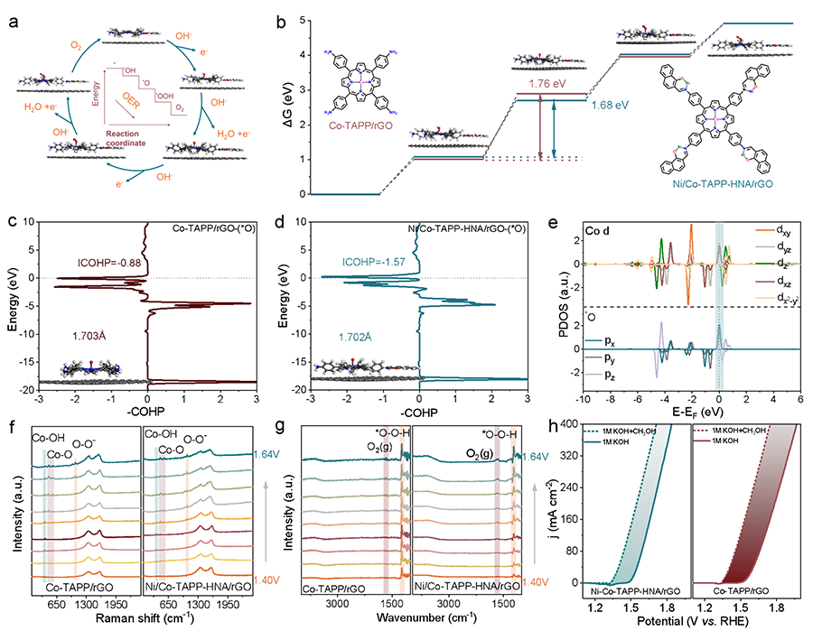 图4.a)Ni/Co-TAPP/rGO在碱性环境中的OER过程示意图。b)Co-TAPP/rGO和Ni/Co-TAPP-HNA/rGO在OER每个基本步骤中的吉布斯自由能。*O吸附的COHP分析:c)Co-TAPP/rGO和d)Ni/Co-TAPP-HNA/rGO。Co-TAPP/rGO和Ni/Co-TAPP-HNA/rGO的原位拉曼光谱f)和原文红外分析g)。h)Ni/Co-TAPP-HNA/rGO和Co-TAPP/rGO在1.0 M KOH中(含和不含0.602 M CH3OH)的LSV曲线。