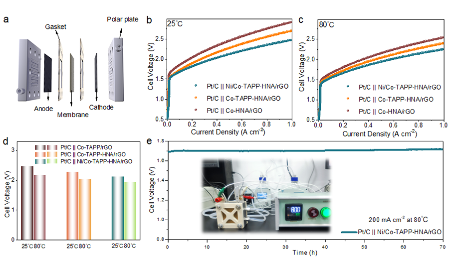 图5.a)AEM电解槽示意图。分子纳米结催化剂在1.0 M KOH中的极化曲线:b)25°C和c)80°C。d)水电解的电池电压。e)Ni/Co-TAPP-HNA/rGO||Pt/C在1.0 M KOH中的计时电位曲线。