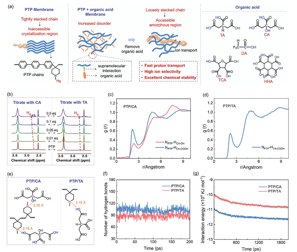 图1 a)通过超分子相互作用破坏聚合物链的密集堆积以促进快速和选择性质子传输的示意图。(PTP:聚(对-三联苯-N-甲基哌啶),TA:丙三酸,CA:柠檬酸,DA:二氟乙酸,TCA:四氢呋喃-2,3,4,5四羧酸,HHA: 1,2,3,4,5,6-环己烷六羧酸)。b)使用DMSO-d6作为溶剂,通过向PTP溶液中逐渐加入不同当量的CA(左)或TA(右)进行1H NMR滴定。c)PTP/CA体系中NPTP-HCA-OH和NPTP-HCA-COOH的径向分布函数(RDF)曲线。d)PTP/TA体系中NPTP-HTA-COOH的RDF曲线。e)从RDF曲线推导出的PTP和CA(左)以及PTP和TA(右)之间的氢键相互作用。f,g)PTP/CA体系中PTP与CA之间以及PTP/TA体系中PTP与TA之间的氢键数和(f)相互作用能(g)。