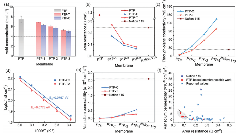结晶度的降低导致PTP基膜的酸和水吸收增强。如图3a所示,原始PTP膜(> 7.5 M)内的酸浓度高于环境酸溶液(3.0 M),这是因为PTP结构中的哌啶基团促进了硫酸富集。相比之下,PTP-Cx和PTP-Tx系列膜显示出比原始PTP膜更低的膜内酸浓度,可能是由于膜内部和外部酸性溶液之间的渗透压梯度,这有利于水的吸收而不是酸。如图3b所示,PTP基膜的面电阻随着有机酸的增加而显著降低。根据面电阻计算的质子传导率消除了厚度变化的影响,PTP-C2/T2和PTP-C3/T3膜的质子传导率是原始PTP膜的13.3-31.2倍,是Nafion 115的2.4-5.6倍(图3c)。质子传输主要由Grotthuss机制驱动,活化能低于0.4 eV证明了这一点(图3d)。如图3e所示,基于PTP的膜表现出优异的阻钒性能,比Nafion 115低一到两个数量级。总的来说,PTP-Cx和PTP-Tx膜实现了低面电阻和最小钒渗透之间的有效平衡,在降低面电阻和提高质子电导率方面取得了显著进步,超过了最近报道的其他文献(图3f)。