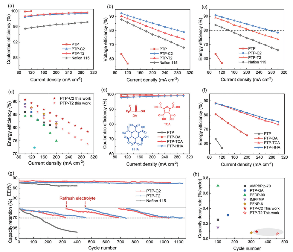 图4 a-c)由PTP、PTP-C2、PTP-T2和Nafion 115膜组装的钒RFB在100-300 mA cm-2电流密度范围内的库仑效率(CE)、电压效率(VE)和能量效率(EE)。d)将PTP-C2/T2在这项工作中获得的EEs与之前报道的基于聚(芳基哌啶)的膜的EEs进行比较。e、f)在100-300 mA cm-2电流密度范围内,PTP、PTP-DA、PTP-TCA和PTP-HHA膜组装的钒RFB的CE和EE。g)在240 mA cm-2的电流密度下,组装有PTP-C2、PTP-T2和Nafion 115膜的钒RFB的循环性能。当容量衰减到其初始值的70%时,电解质被更换。h)本研究与之前报道的基于聚(芳基哌啶)的钒RFB膜的特定循环的容量衰减率数据对比。