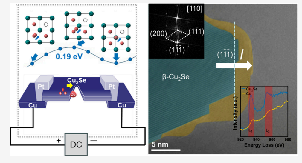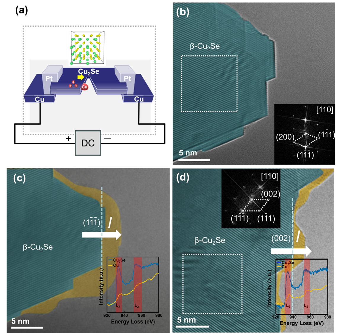 通过在0.5 V偏压作用下,β-Cu₂Se薄膜中Cu⁺离子沿不同晶体学方向迁移的实时动态。发现当电场垂直于(1)面时,600秒内Cu析出速率显著高于(002)面(图1c和d)。电子能量损失谱(EELS)证实析出物为非晶态Cu(图1c插图),其形成归因于偏压不足以使Cu结晶。这一结果表明〈111〉方向是Cu⁺离子长程迁移的优先路径,且迁移速率与晶体取向密切相关。