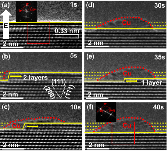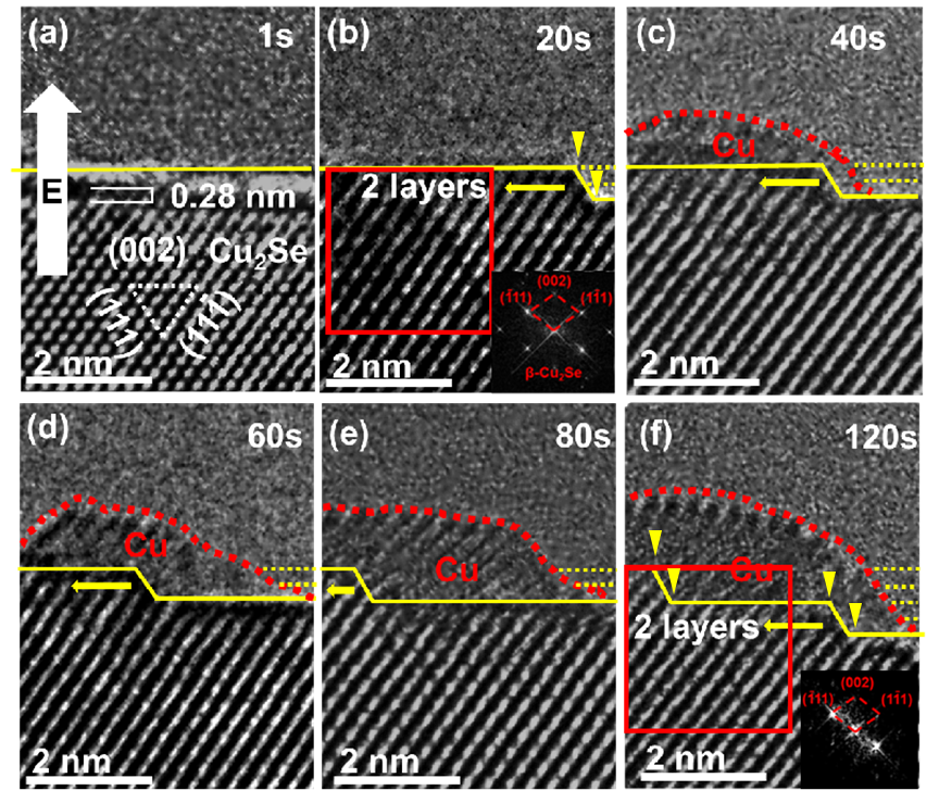 图2:在垂直于(002)面施加 0.5 V 偏压的条件下,获得了原位高分辨率透射电子显微镜(HRTEM)图像,以展示 Cu2Se 薄膜(111)面上铜沉积的动态演变过程