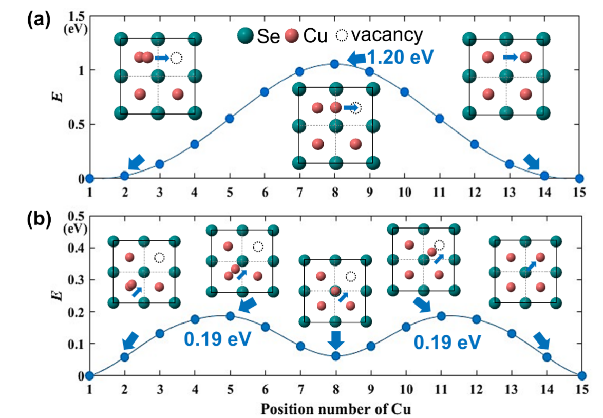 图4:图中展示了由 DFT 计算得出 Cu+离子跳跃路径,其通过最近四面体间隙位置沿<111>方向跳跃和最近邻 Cu+离子的跳跃对应于<001>方向的能量分布