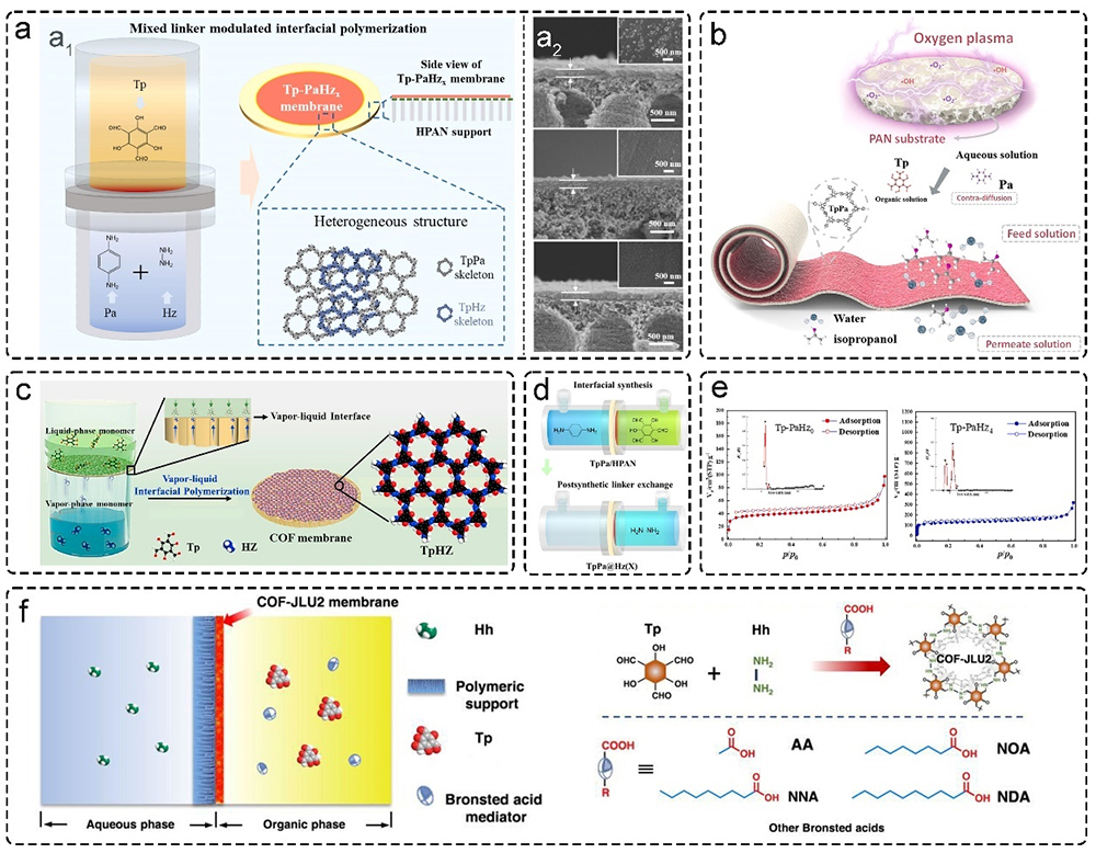 图9展示了基于COF材料的界面聚合过程与膜结构表征:(a)为Tp-PaHzx膜的制备过程示意图,(a1)显示合成路径,(a2)为不同Hz浓度条件下的对应SEM图像;(b)为经氧等离子体刻蚀处理后的TpPa/PAN膜制备过程;(c)为通过气-液界面聚合法构建的TpHZ/PAN膜;(d)为采用水解PAN(HPAN)为基底构建的TpPa/HPAN膜;(e)为Tp-PaHzx(x=0, 4)膜的氮气吸附-脱附等温线及对应的孔径分布(插图);(f)为通过Brønsted酸介导合成的COFs-JLU2膜结构示意图。