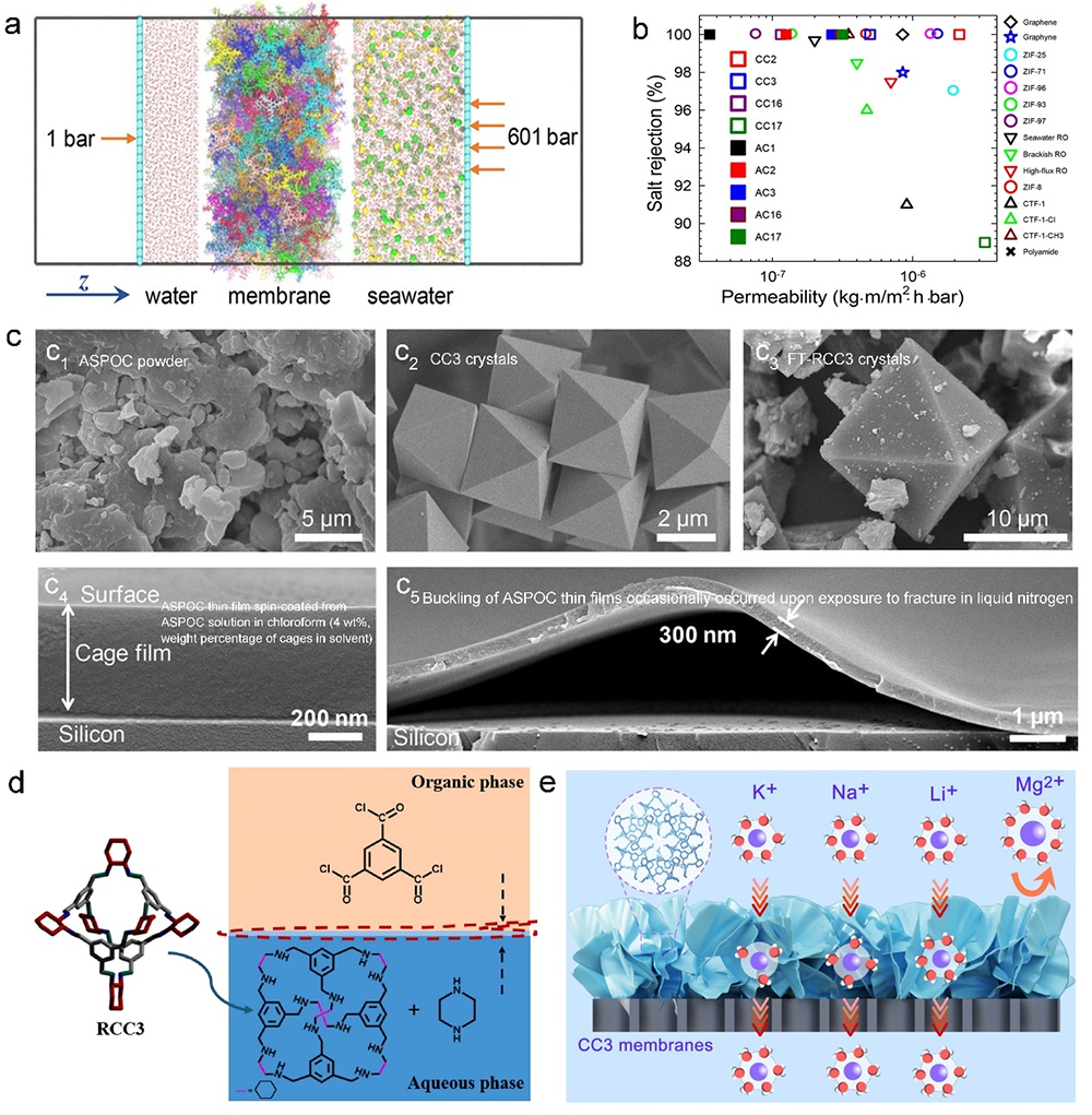 图10展示了基于多孔有机笼体(POCs)材料的膜构建及其分离性能:(a)为脱盐系统的整体示意图;(b)为不同膜材料渗透性能的对比结果;(c)为POC膜的形貌与结构图像;(d)为基于POC材料的界面聚合过程示意;(e)为CC3膜的分离机制图,展示了其对溶质的截留过程。