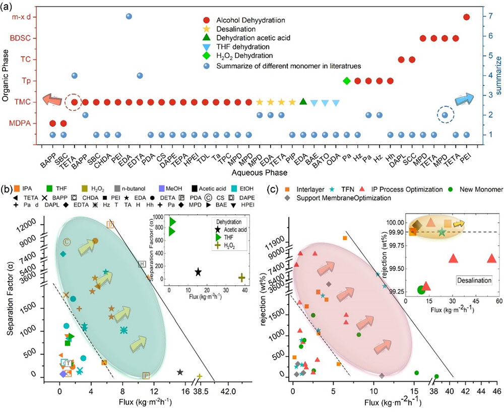 图11展示了近五年基于界面聚合(IP)的渗透汽化(PV)膜研究的统计与性能分析:(a)为IP膜在PV领域应用的统计结果,涵盖不同的水相/有机相单体组合(如间二异氰酸二甲苯 m-xd 和反式-5-降冰片烯-2,3-二羧酰氯 TC);(b)为基于IP的PV膜在水/醇选择性与通量之间的性能权衡关系图,虚线所示的上限主要由传统单体(如BAPP、DEPA、TETA/TMC)构成,实线所示的性能上限则基于新型单体(如Pa和Hh),插图为基于IP膜对乙酸、四氢呋喃和过氧化氢的脱水表现;(c)为采用不同构筑策略制备的IP膜在选择性与渗透性之间的权衡分析,虚线代表传统手段(如控制IP过程、引入中间层等)构建的性能上限,实线则代表采用新技术(如TFN膜)构建的性能边界,插图展示了不同方法下用于脱盐的IP膜结构示意图。