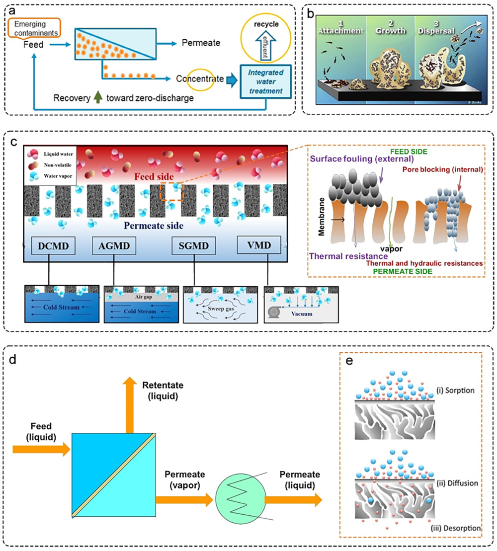 图1展示了典型膜分离技术的基本过程与机制:(a-b)为反渗透过程中水分子通过半透膜以及膜表面生物膜形成的示意;(c)展示了传统膜蒸馏工艺的不同实现路径,并标示了膜污染的典型部位;(d)为渗透汽化过程及其工作机制;(e)则为渗透汽化中基于溶解-扩散模型的传质机制图示。